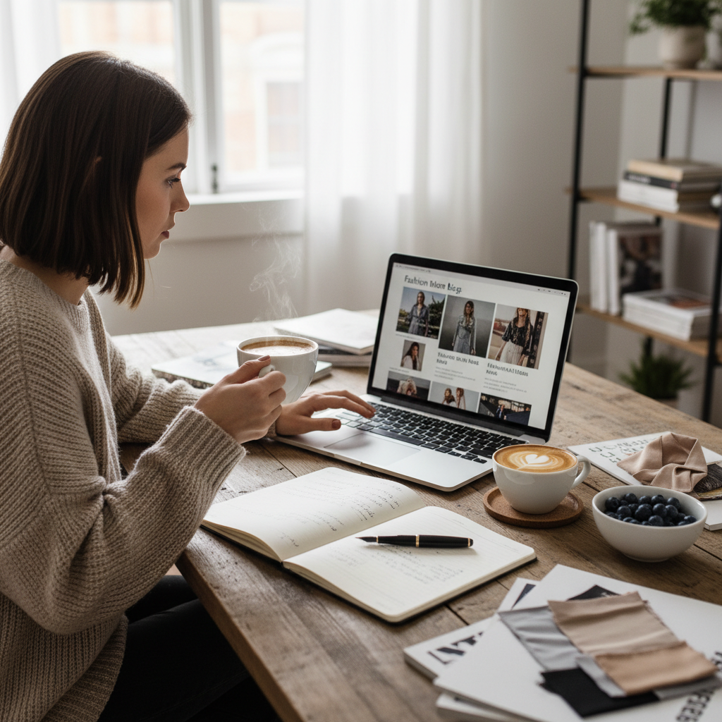 Alt: Przeglądanie blogów modowych na laptopie, kawa i notatki