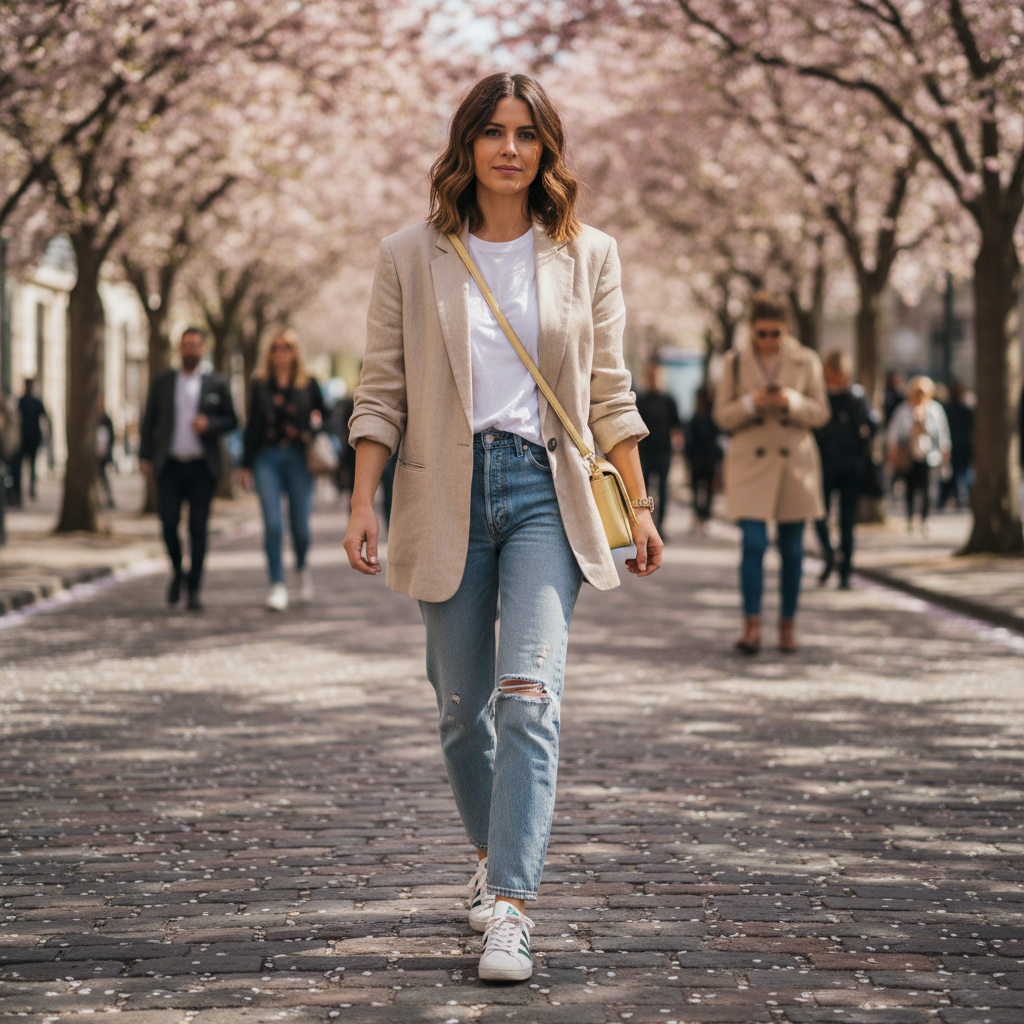 Stylizacja wiosenna z marynarką oversize i sneakersami – alternatywa dla trencza.